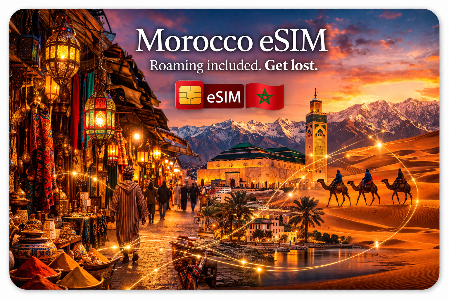 Get highest speeds in Morocco with this eSIM plan. Start your eSIM instantly upon arrival in Morocco and enjoy high-speed data with no hidden roaming fees.